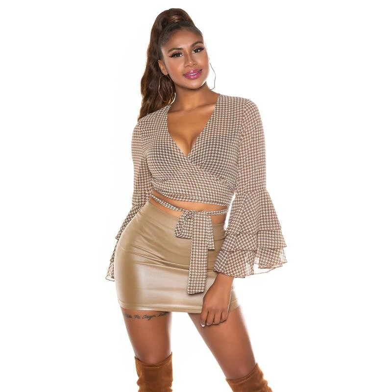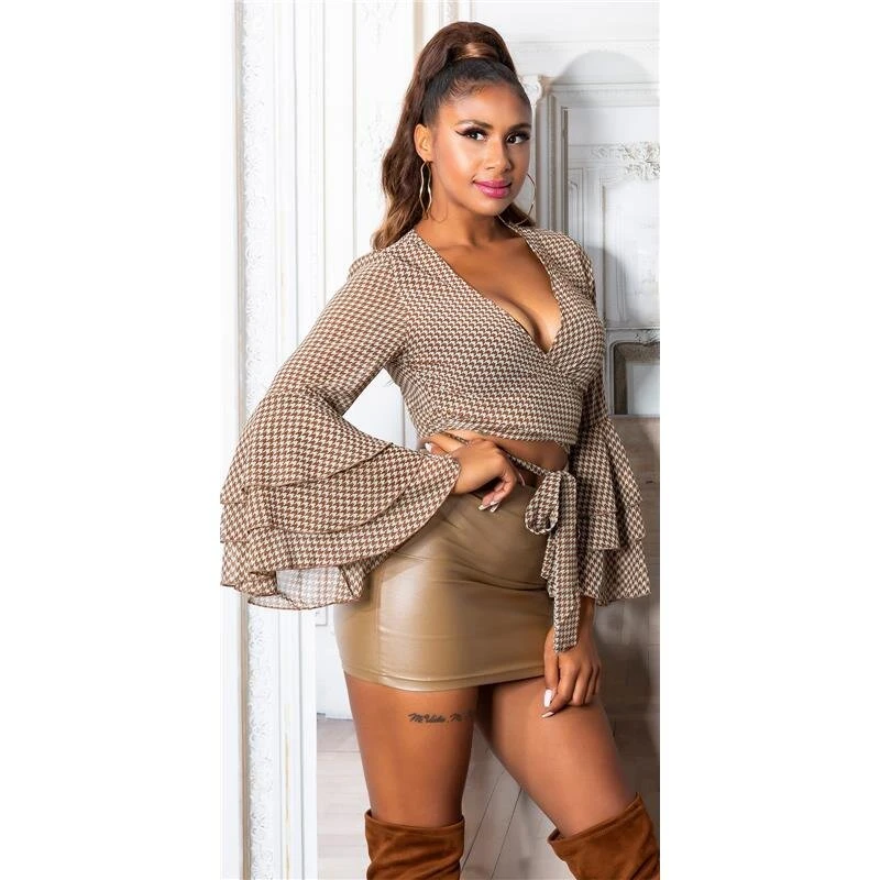 - Elegante bauchfreie Damen-Wickelbluse aus halbtransparentem Chiffon mit Hahnentrittmuster