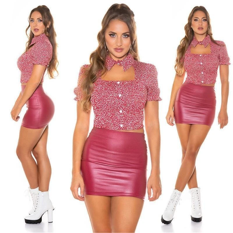 - Süßes bauchfreies Damen-Top mit Animalprint, spitzem Kragen und kurzen Puffärmeln