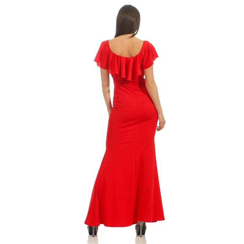 - Elegantes bodenlanges Abendkleid mit bezauberndem Ausschnitt in rassigem Carmen-Stil mit Volant