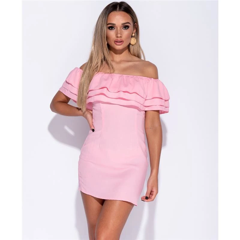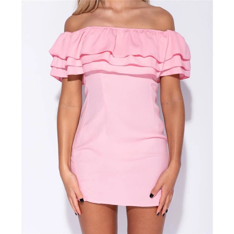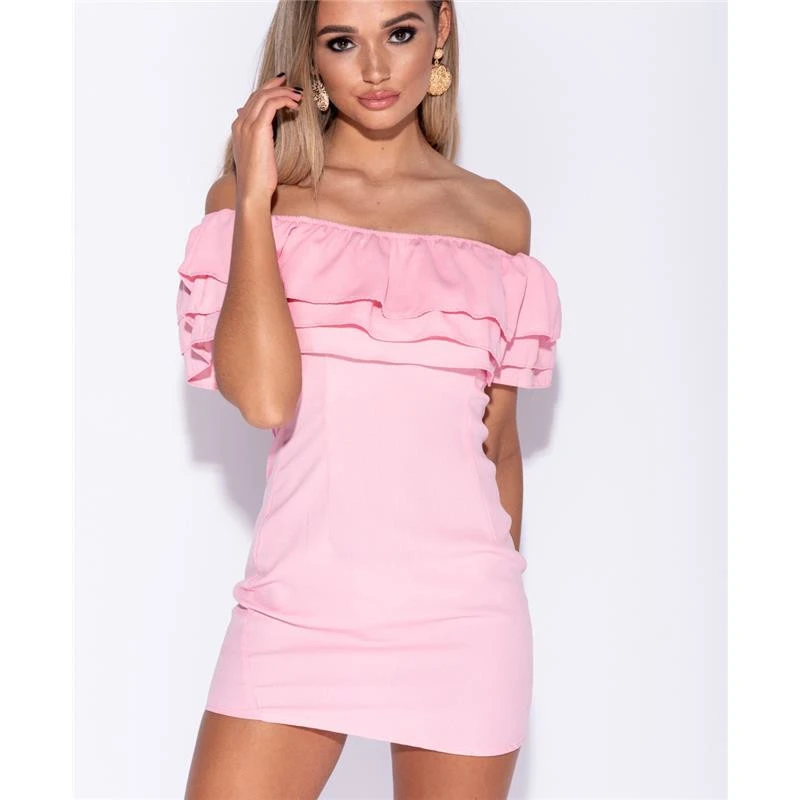 - Bezauberndes Bodycon Minikleid mit rassigem Volant-Ausschnitt in Carmen-Stil