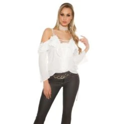Sexy Langarm Carmen-Look-Bluse Mit Volants Und Spitze Weiß