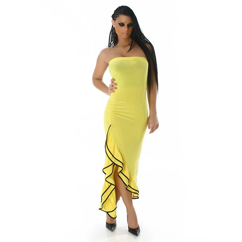 - Dynamisch verlaufende Streifen an den Volantabschlüssen betonen zusätzlich den schwungvollen Schnitt des Kleides