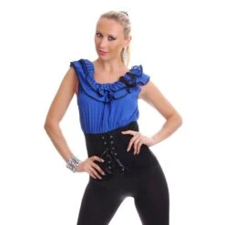 - Der untere Bereich ist aus eng anliegendem, tailliertem Stretchstoff, an dessen Vorderseite sich eine Schnürung befindet. An der Rückseite breite gesmokte Partie