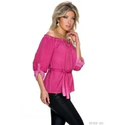 - Kurze Ärmel, spitzer Kragen und Bindebändchen am Saum